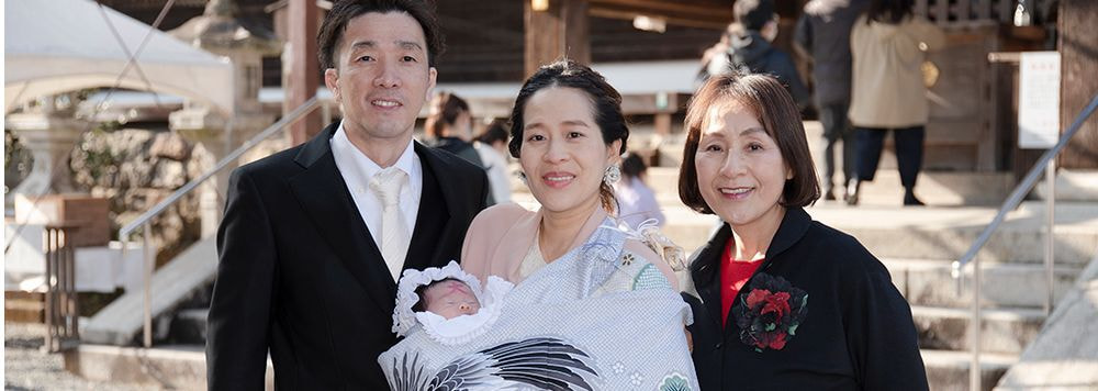お参りは、母方の実家から贈られた祝着を赤ちゃんにかけ、父方の祖母が抱いて参拝するのがしきたりです。